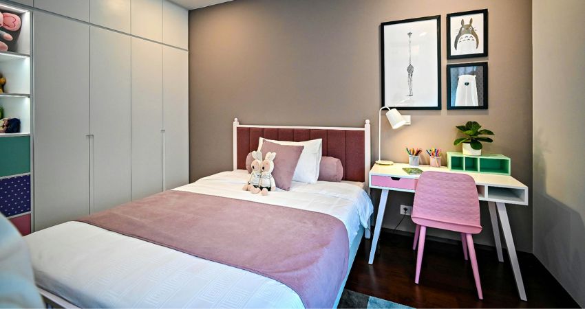 For bedroom inspiration, the decor here shows that the bed does not need to be surrounded by overwhelming patterns. Small decorative accents above and around the bed are enough to create interest. That keeps the room calm, which is often better for sleep quality, especially in a bedroom shared by children.