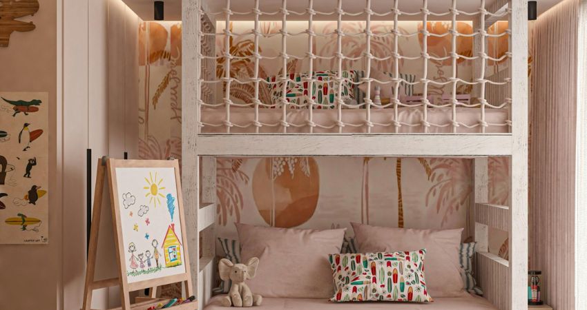 This image is a strong example of how to design a shared kids’ bedroom around a bunk bed. It shows that the bed can be the centerpiece while still leaving room for storage, light, and movement. The room feels suitable for siblings because it creates individual sleeping levels while maintaining a unified look.
