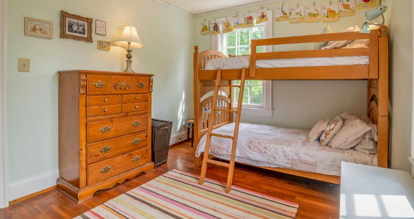 The tall wooden dresser on the left side of the room complements the bunk bed beautifully. Both pieces use warm wood tones, which create visual harmony and give the bedroom a coordinated, vintage-inspired feel. This is a good lesson for bedroom planning: when the bed is made of natural wood, matching or similarly toned storage furniture can make the room feel more intentional.