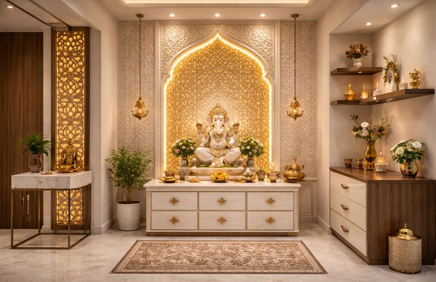 This thoughtful integration of storage keeps the pooja room organized while preserving its visual harmony.