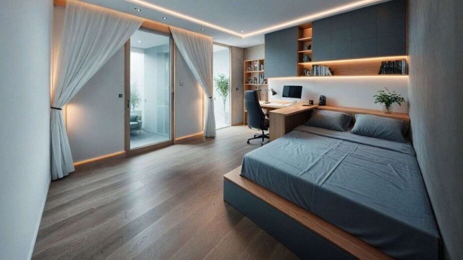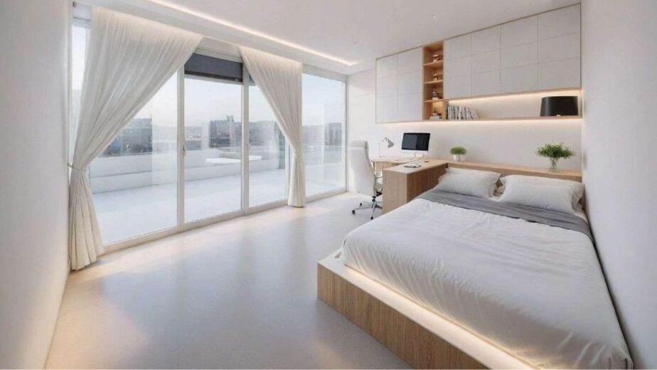 The bedroom incorporates minimal yet highly functional furniture pieces. Sleek bedside tables with clean lines complement the bed without overwhelming the space. Built-in wall panels and storage elements blend seamlessly into the design, maintaining a clutter-free look. This approach demonstrates how functionality and style can coexist, especially in modern interiors where simplicity is key.