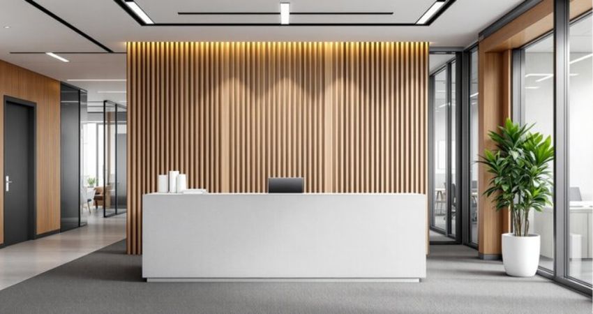 • Seamlessness: By using the same flooring throughout the entire hall, the space feels unified and expansive. It prevents the room from feeling “chopped up,” which is essential in an open-plan office.