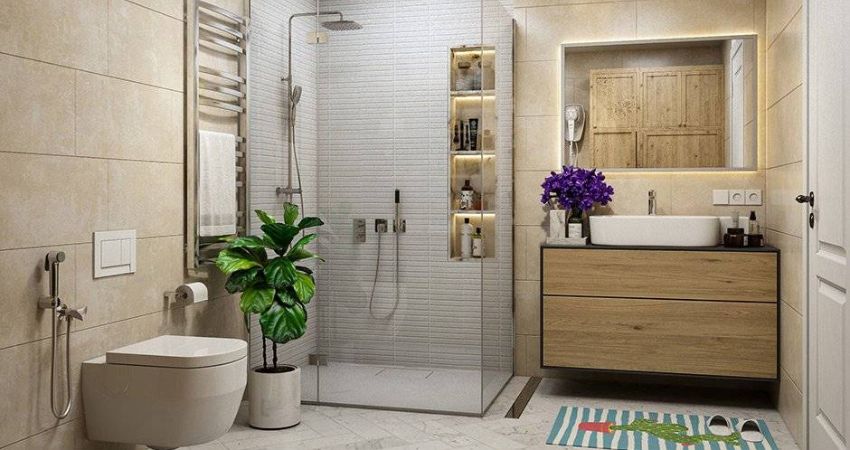 The foundation of this bathroom lies in its soft, neutral color palette. Shades of white, beige, and light grey dominate the space, creating a calm and airy environment. These tones not only enhance the feeling of cleanliness but also make the room appear more spacious and open.