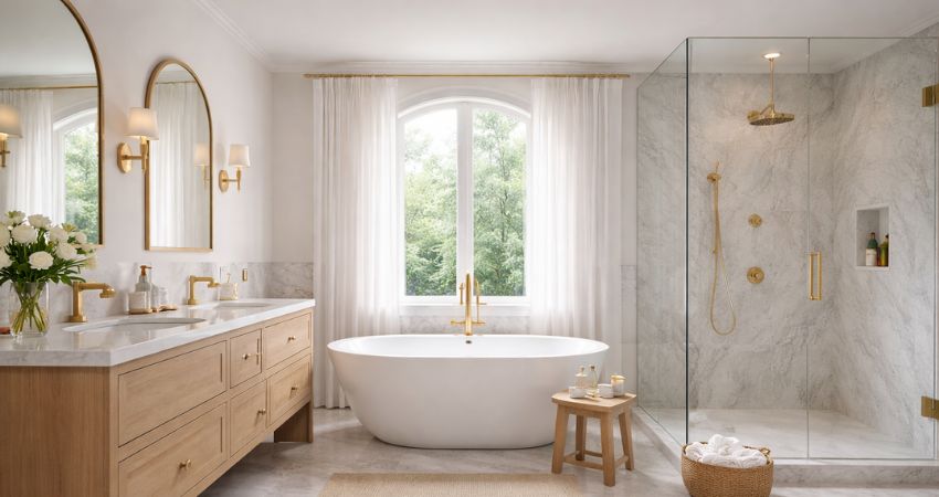 A luxury bathroom is more than just a functional space—it is a sanctuary of relaxation, comfort, and refined design. The image presented captures a beautifully curated bathroom interior that blends classic elegance with modern sophistication. From the freestanding bathtub to the marble finishes and soft natural lighting, every detail in this space is thoughtfully designed to create a calming and indulgent experience.