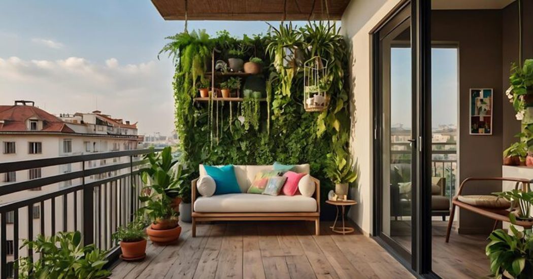 One of the most attractive parts of this balcony is the use of plants as a major design element. The vertical green wall, hanging planters, and potted plants bring life into the space and make it feel fresh and calming. This kind of natural styling is perfect for people who want to give their home interior a warm and eco-friendly touch.